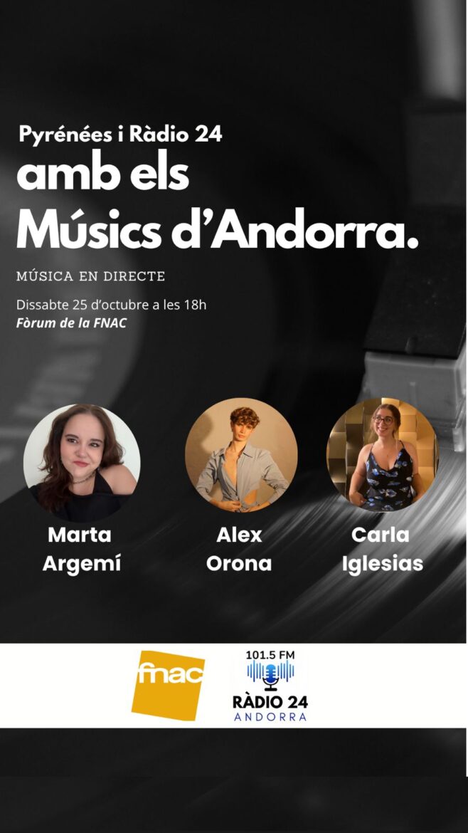 L’actuació, organitzada amb el suport de Ràdio 24 Andorra, forma part de la col·laboració amb FNAC Pyrénées, que aposta decididament pel talent musical del país i per oferir una programació cultural de qualitat oberta a tothom.